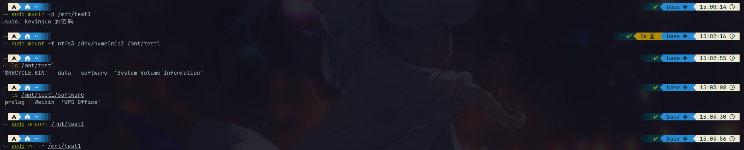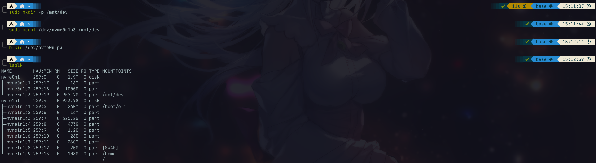 shell# 注意这里的 dev 取名是可以自定义的 sudo mkdir -p /mnt/dev sudo mount /dev/nvme0n1p3 /mnt/dev