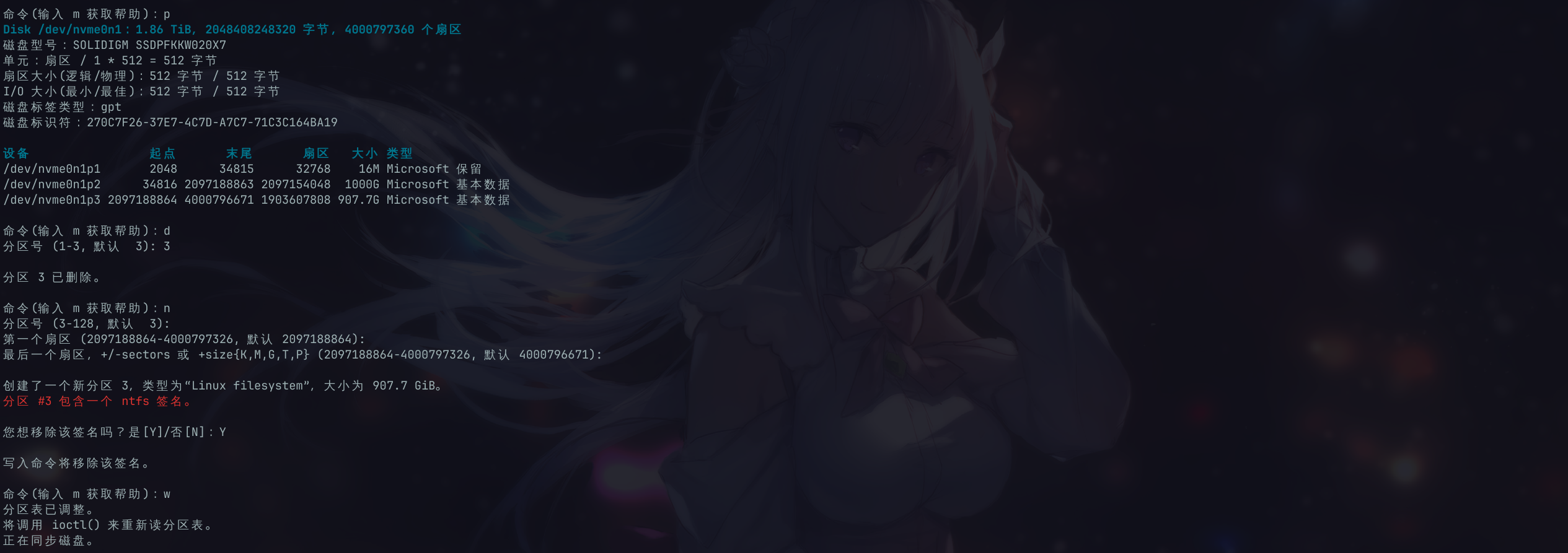 shellsudo fdisk /dev/nvme0n1p3 # 输入 p 查看当前分区表。 # 输入 d 删除不需要的分区。 # 输入 n 新建分区(选择主分区或默认即可)。 # 输入 w 保存并退出。