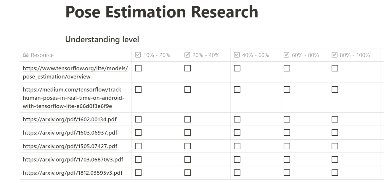 在下一步中,你将对你认为与主题相关的任何资源进行深入研究。重要的是要有一种方法可以跟踪对每个入围资源的理解。吴恩达建议绘制一个与你的理解水平相对应的资源表,它看起来与下表相似: